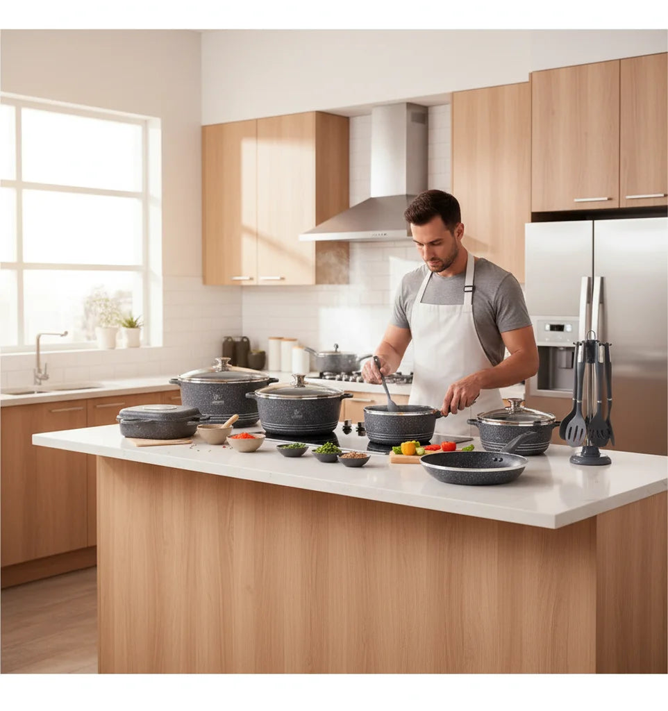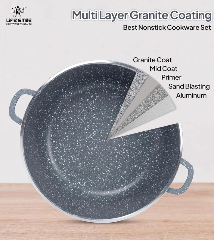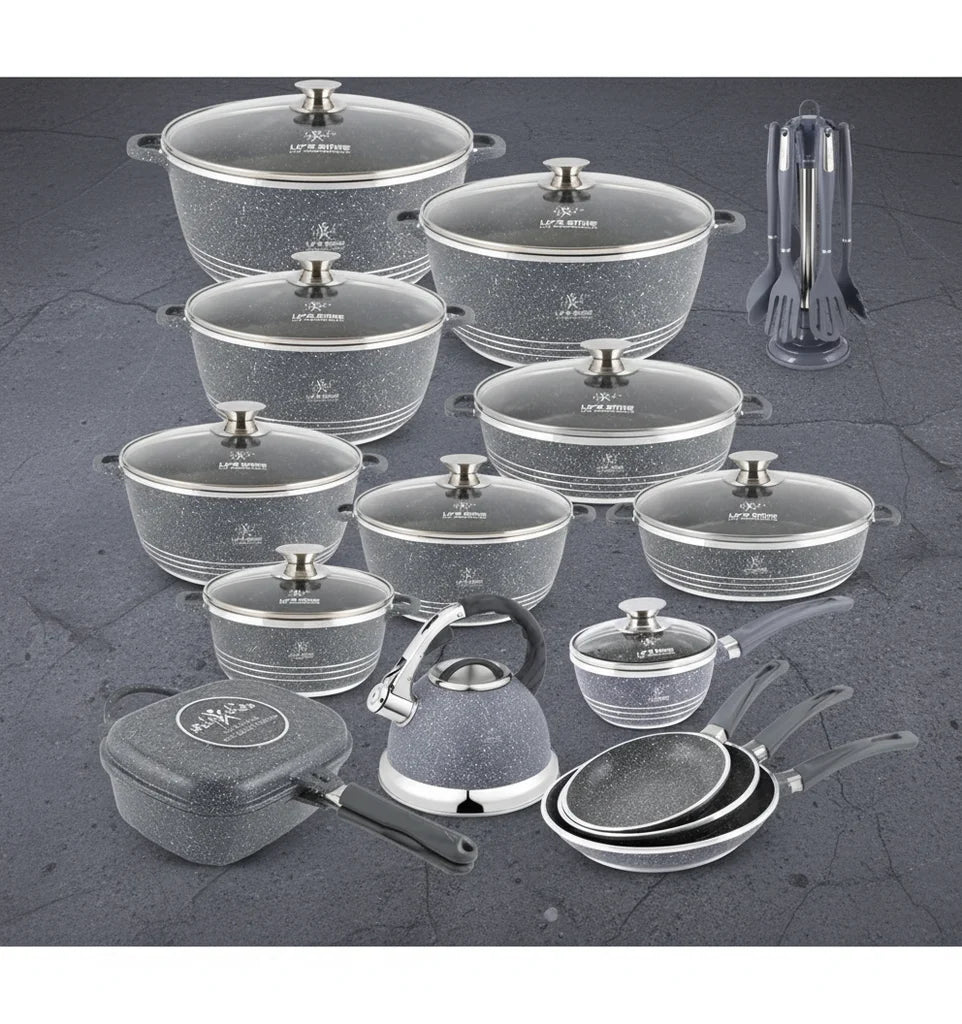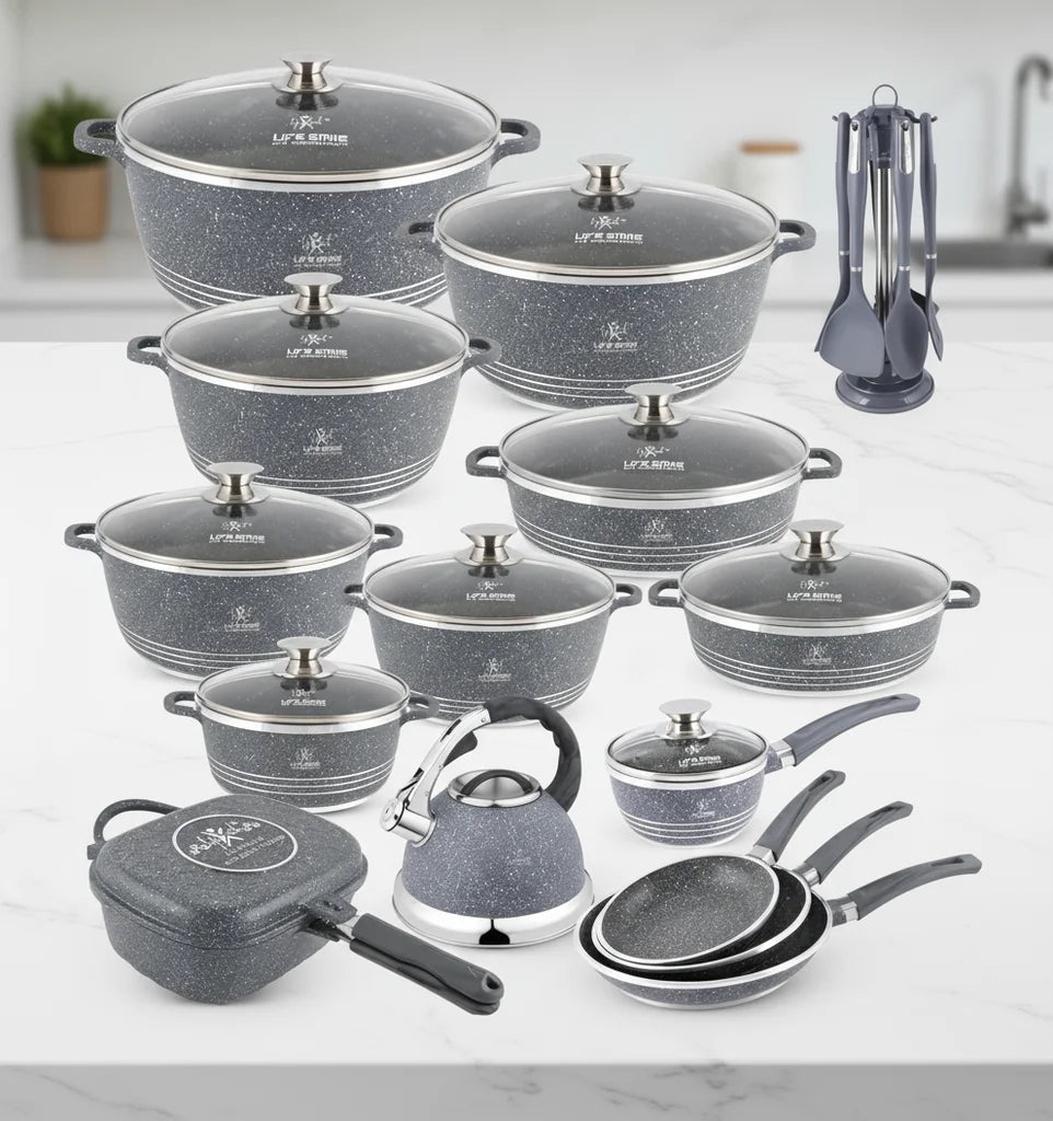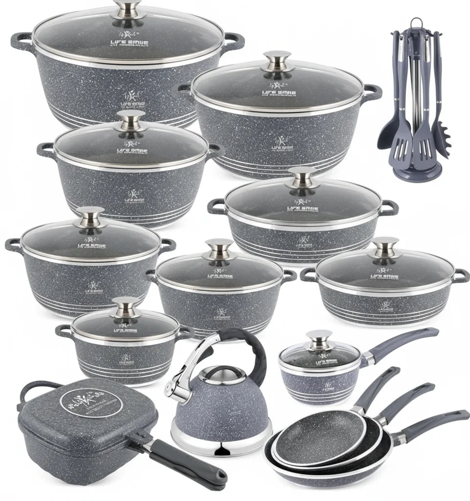 The LIFE SMILE set offers a complete 31-piece collection with a stunning granite stone design, superior PFOA-free non-stick performance, and exceptional durability. It's designed for both beauty and high-performance cooking.